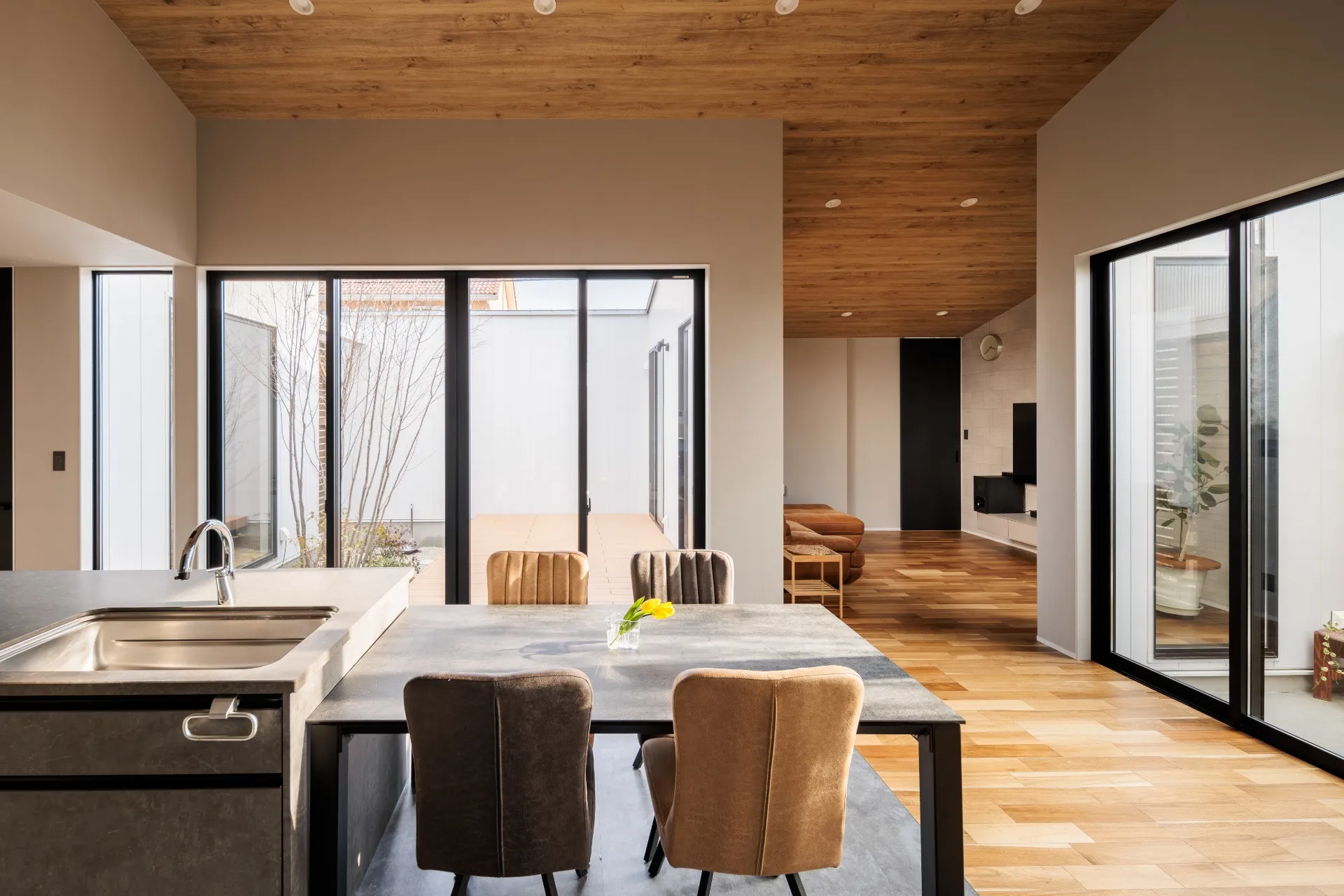 2025年の注文住宅のトレンドとして、サステナブルデザインが注目されています。その中で、L字型リビングは自然素材との相性が非常に良い間取りとして注目されています。例えば、無垢材をフローリングや壁材に使用し、木の温かみを活かしながらも空間全体に統一感を持たせるデザインが人気です。また、L字型の特徴である直線的でシンプルなフォルムを活かし、木材やタイル、ブラックアイアンなど異素材の組み合わせを楽しむことで、ナチュラルかつ洗練されたインテリアを実現できます。